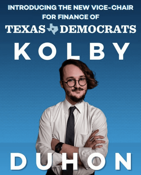 Over the weekend, Texas Democrats elected Kolby Duhon as their new vice chair for finance. The position is responsible for a variety of duties related to the party’s raising and spending of money.